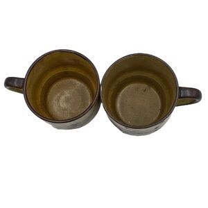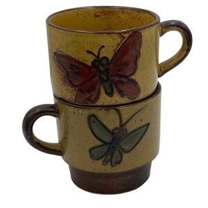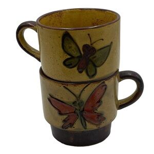 Vintage 70’s Handcrafted Ceramic Stackable Butterfly Coffee Mugs Tea Cups. Set of 2. Yellow speckled glaze with contrasting brown handle and base and green & red butterflies. Excellent vintage condition. Please see all photos for details. Holds 10 oz. each.