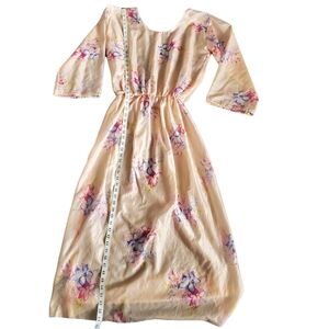 Beautiful semi sheer handmade 70s era floral mumu caftan dress. Pull On bluson style is both forgiving and flattering. The elastic waostbhas about 5" stretch. No tags, see photos for measurements. In excellent gently worn condition.