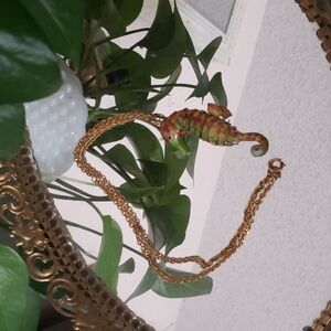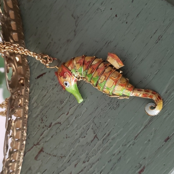 Vintage 70s Hinged Enameled Sea Horse Statement Necklace