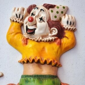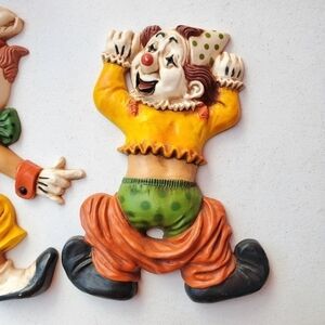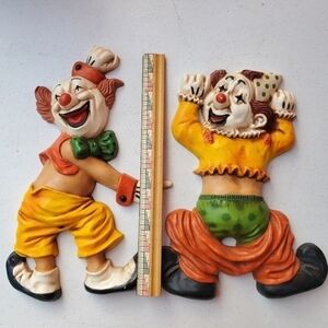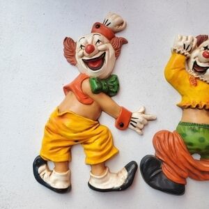 Vintage 70's Homco Circus Clowns goofin around wall plaques hanging decor. They are Approximately 11 to 12.5" tall, bright colors, Very good condition with so.e minor scuffs and scratches. No crack. Wall hook on back.