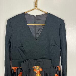 Stunning vintage gown with a black, v-neck bodice, statement bow at waist, and flowy, black and gold paisley print skirt! No material tag or size listed. Please see measurements to ensure preferred fit.