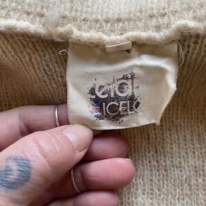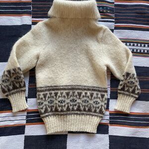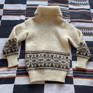 Beautiful unisex Kids Wool Sweater. Feels like Mohair but cant be certain since tag is unreadable. Can only make out Iceland and cant find it anywhere. Sweater is thick and Zip up. Has big collar. Has an untreated spot on cuff as seen in photo. Also has a snag on front that can be mended if desired. I do not mess with wool because do not want to ruin a vintage piece as Beautiful as this. Sold as is. Size 8 but fits much smaller so please double check measurements and photos for best description and let me know if you have any questions.