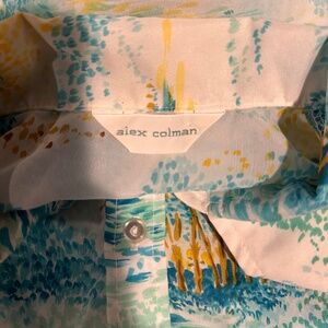 Vibrant 70s button-up shirt with a scenic tree print. Features shades of blue, yellow, and green.