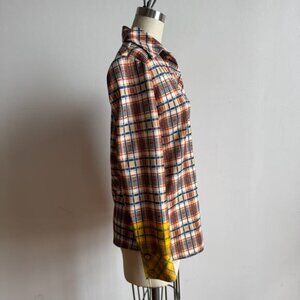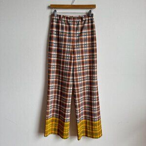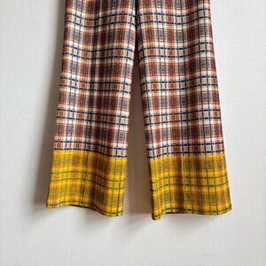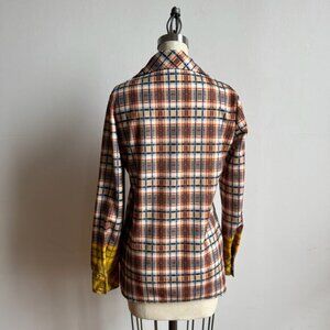 Details: Vintage unique Jantzen leisure suit that was certainly meant to evoke disco if not to be worn AT the disco. Button up blazer top features a long pointed collar and functional pockets. The high waisted flare trousers have belt loops. Both the pants and top have a matching orange blue and beige plaid pattern, (custom?) painted yellow sleeve and hem accents, and mesh lining. Rare 70s retro find!