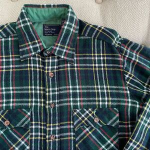 Vintage JCPenney the men’s shop green plaid flannel button up shirt with western style flap button chest pockets. Laying flat measures approximately 28 inches from shoulder to hem and 21.5 inches from armpit to armpit