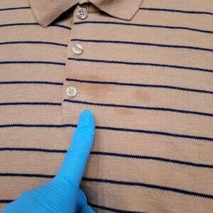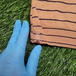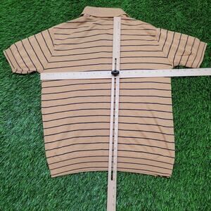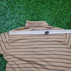 Vintage 70s JCPenney Striped Knit Polo Shirt Womens Medium Banded Hem Blouson Fit Horizontal Stripe Pinstripe Disco Mod Rockabilly 100% Acrylic Tan Camel Brown Navy Stripe