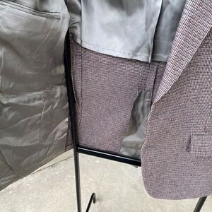 This vintage Jaymar blazer embodies classic menswear style with a tailored silhouette and meticulous craftsmanship. Made in the USA, it features a timeless houndstooth check pattern in shades of red, black, and grey. This blazer showcases a structured fit, notch lapel, two-button front closure, and flap pockets. The sleeves are detailed with three-button cuffs, and the interior is lined with grey satin and accented with a quality inspection tag. Expertly crafted in USA for enduring style, this blazer offers a versatile and polished look, whether styled for business or as a statement piece for modern androgynous fashion.
