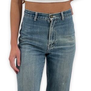 Women's vintage 1970s high waisted jeans. Medium wash blue with awesome natural patina & light distressing. 100% cotton and Made in Taiwan.