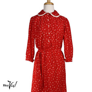 * Special Feature: Red and white print Vintage Dress has double Peter Pan Collar red over white. Sleeves have a slight puff at top, sleeves button closed and have a fold up cuff with flare. Self tie belt.