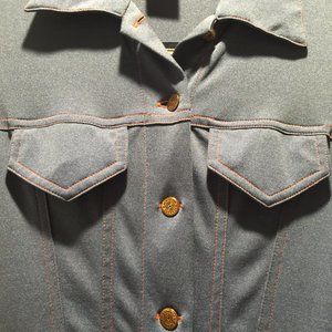 This is total authentic Daisy Jones attire! Tag reads Joy Stevens California # 16970 Finest Fabrics there is NO size on dress. I would guess from trying on it is a women's 0-2 or Jr size 3-5 I wear a 2 am 5' 4" and 110 lbs (it is tight on the waist but can get it buttoned. . It is a small waist band ( waist measurement is just a little over 24 inches) full button up and a slit opening at bottom of dress. It is a poly faux denim in a dusty cornflower denim blue (very popular in the 70 leisure suits) with a red orange accent stitching over all and accent stitching on breast pocket flap and button holes. The buttons are a brass with a print on them, reads " Remmington Exress 20 GA" All buttons In great condition. Appears to have been hand hemmed. (it is not the lighter gray blue in last pics but took pics in brighter light for detail view .
