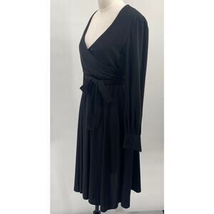 Vintage 70s Kasper Faux Wrap Midi Dress Belted Long Sleeve V Neck Black