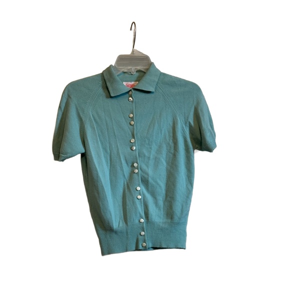 Vintage 70's Kerrybrooke Pale Green Button Front 100% Orlon Short Sleeve Sweater