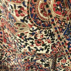 - Ethnic-style floral print pattern in blue, green, and red over a cream background