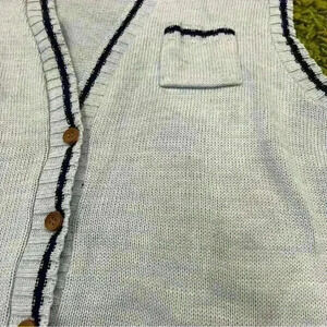 Vintage 70s Knit Baby Blue Sweater Vest. Features wood buttons and a cute lil pocket on the chest. Best fits a medium or large. Brand is Sweet tree. Made in the USA.