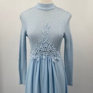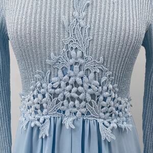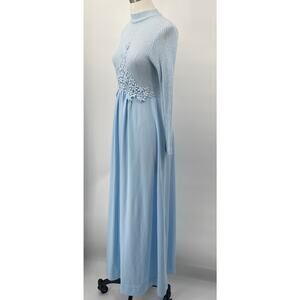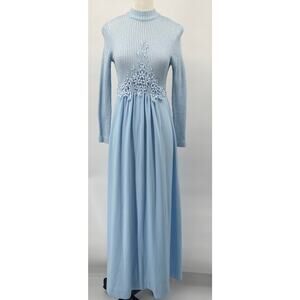 Vintage 70s Knit Floral Embellished Fit & Flare Maxi Dress Long Powder Blue S