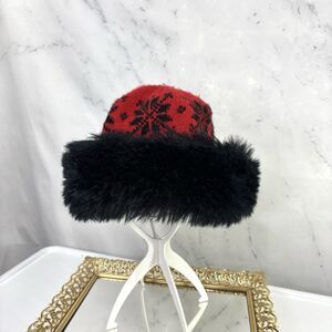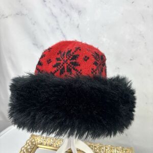 Vintage 70s Knit Russian Hat Women's Nordic Winter Beanie Red Black Faux Fur