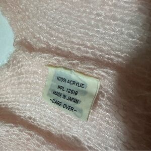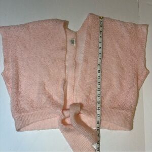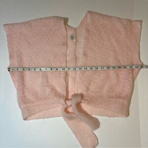 Excellent vintage condition with no stains or flaws noted. Open arm holes. Tie front. Loose, open weave. Light, pale pink. Made in Japan. Best fit a modern small/medium. Please see photos for details and measurements.