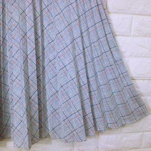 Vintage 70s KoKo Knits of California made in USA, Double Knit polyester blend, accordion Pleated Skirt, ladies size Large (14), textured windowpane Plaid Checked, knee-length Comfort Waist pull-on, easy care washable in knubby shades of Pastel Blue with Navy Red stripes. In used pre-owned* condition with no outwardly visible flaws - there is yellowy discoloration/hang fade lines on some of the back pleats, two stains at waistband, little dingy could use a wash/soak in OxyClean - see pics for detail. On trend Knitwear Preppy Academia Street Grunge Career Casual Secretary Grandma Chic