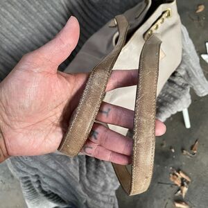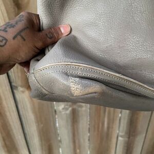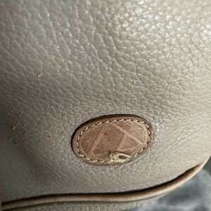 Vintage 70s Liz Claiborne bag in taupe pebbled leather with adjustable snap cinch straps on each side, straps long enough to fit over the shoulder. black cotton lining.