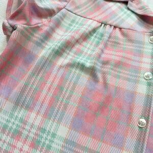 authentic vintage 1970s Land n’ Sea short sleeve button up blouse featuring a soft pastel plaid print in pink, mint, peach, and lilac tones. made from stretch Fortrel polyester with sweet puff sleeves and gathered detail at the shoulder. true retro charm. no size, fits XL+, see measurements!