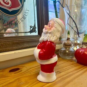 He features a wonderful Mid-Century aesthetic with bright blue eyes, rosy "blushing" cheeks, and a textured white beard. A must-have for any collector of "Kitschmas" or vintage holiday rubber toys.