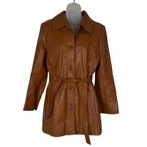 Vintage 70s Leather Belted Short Trench Style Mod Groovy Tan Jacket Women's S/M