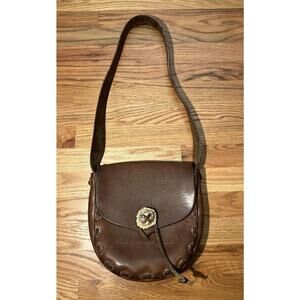 This is a 1970s vintage hand-crafted leather bag. Beautifully aged, saddle brown leather shapes the boho bag with thick leather stitching. Front flap that closes with antler embellishment and strap. A thick leather strap carries the bag.
