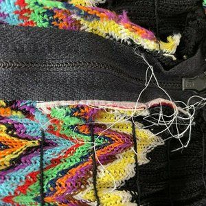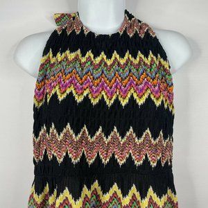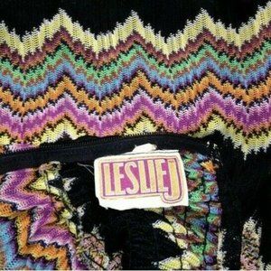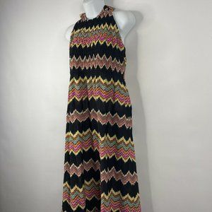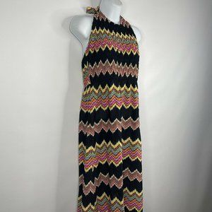 Vintage 70s Leslie J Maxi Halter Dress Size S Black Rainbow Knit Flame Stitch