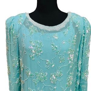 Vintage 70’s Light Blue 100% Silk Formal Dress 2 Piece Slip & Long Beaded Tunic