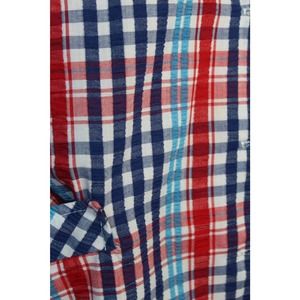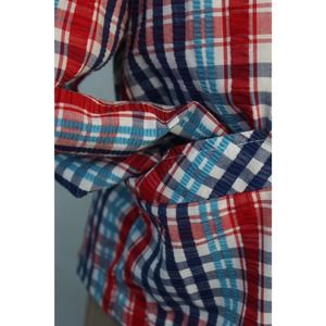 Vintage 1970s lightweight blazer made with plaid seersucker material. Features oversized white buttons, patch pockets, a straight hem, and long sleeves. Boxy shape. There are tags but the ink has completely faded. 40" bust, 40" waist, 25" length.