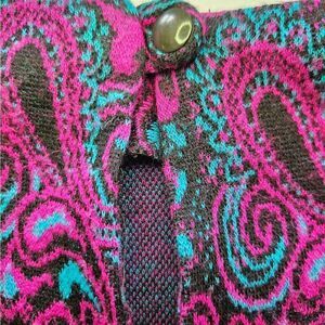 This is an absolutely gorgeous vintage dress. I believe it is from the '70s. Made from a knit weave in a vibrant purple paisley pattern. Long sleeve styling with a high, crew, neck. It is a form fitted style with a slight flare when it reaches the drop waist. This is just so cute. I bought this with the hopes that it would fit me but it is just way too small. The label is pretty old and faded and I can't quite make out the fabric content. It looks like the first three letters may possibly be AOR. I'd say the size based on the measurements would most comfortably fit a size 4 or 6 depending on how you like it to fit. The fabric is pretty thick and warm. This would be adorable in the fall and winter paired with some cute boots. I have held onto this for years with the hopes I would someday fit into it but I am finally throwing in the towel and letting it go. It is a truly spectacular vintage gem.
