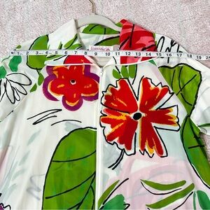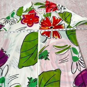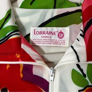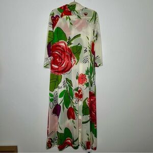 Beautiful sheer 2/3 zip kaftan from vintage brand Lorraine. Embrace vibrant style with this floral print maxi house dress. Featuring bold red, green, and purple hues.