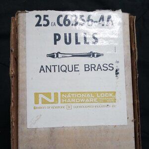 Vintage 70s MCM National Lock Decorator Hardware Antique Brass Drawer Pulls (20) - 1971 - Made in USA - Original Box Included (Pictured) - 25 Count Box (20 Drawer Pulls Remaining With No Screws) - YOU GET 20 Drawer Pulls (Not 25) And Nothing Else Included - Excellent Condition, No Flaws - 3" Hole Centers - 4" Total Length