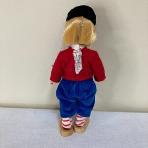8-inch Wendy boy doll with blond hair, blue sleep eyes, wearing a traditional costume of the Netherlands in red, blue and black. Includes jacket, pants, wooden shoes, and hat. Includes original packaging. Child's doll collection; shows signs of use. Made in USA.