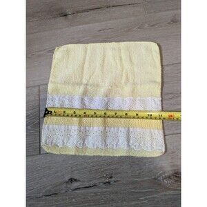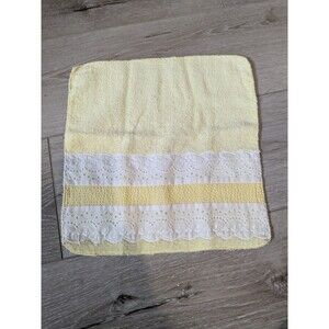 Set of Martex yellow towels with white lace accents. The set includes a bath towel, a hand towel, and a washcloth. The towels are in very good used condition with some light wear.