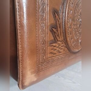 This Vintage Mexico Hand Tooled Leather Handbag features a unique design with relief carving of a bullfighter cape and sword, making it a statement piece for women who appreciate artisan craftsmanship The hand-tooled leather exterior in brown with gold hardware accents gives it a rich and vintage look. With inner pockets for organization, a turn lock closure, and a comfortable brown leather wrist strap handle drop, this medium-sized top handle bag is both stylish and functional. Perfect for those who love Western or Aztec themes, this one-of-a-kind handbag is a must-have addition to any wardrobe.