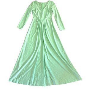 Vintage 70s Maxi Dress Disco Pleated Long Sleeve Deep V-Neck Mint Green