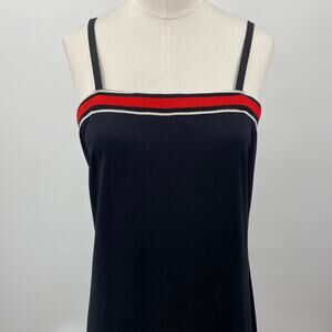 Keywords: 1970s seventies 1960s sixties 60s mod boho bohemian retro long dress aline flowy casual chic classic prep preppy hippie style Union Made USA made knit knitted varsity collegiate inspired strappy sleeveless tank dress vacation travel tennis inspired athletic athleticwear active graphic stripes pattern print bold unique contrasting colors summer summery spring sundress coastal beachy