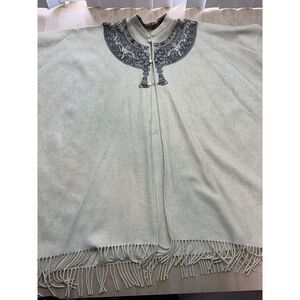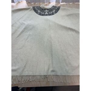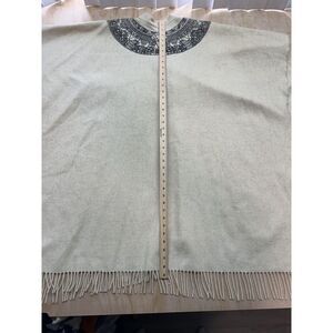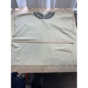 This vintage 70s cape is inspired by the Mayan calendar, featuring a cozy and rustic design perfect for winter. Made of ivory-colored wool, this original piece exudes an Arts & Crafts aesthetic with its boho fringe shawl style. The cape has a shoulder to hem length of 40 inches and is designed as a one-size-fits-all garment, making it a versatile addition to any wardrobe for those who appreciate vintage fashion with a cultural touch. There are no tags for fabric, size or brand. Feels like wool.
