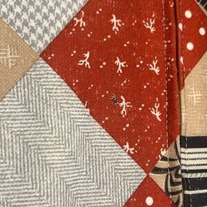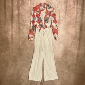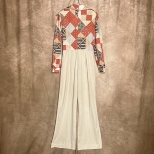 Pantsuit romper is long sleeve with orange, gray, cream patchwork geometric fabric, dagger collar and a tie closure over an attached rib knit cream/tan top. Attached bellbottom pants are a matching cream color. Zipper closure in the back. Vintage 1970s.