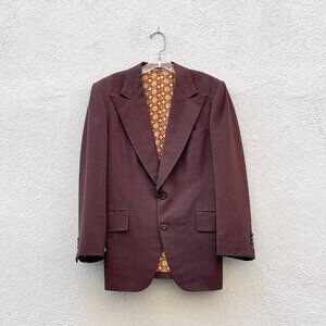 Your disco dreams have come true in this vintage 70s hand tailored men's brown gabardine suit. The jacket has wide lapels, flap pockets, a 2 button closure, and a vented back. Fully lined with a geometric fabric. Flat fronted straight leg trousers with slit front pockets + a zipper and tab closure. No material, size or maker tags. Please use measurements for fit. Approximately 38S x 29W.