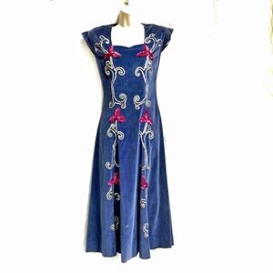 whimsigoth velvet dress, vintage 70s embroidered gown, Stevie Nicks maxi, Florence Welch style, witchcore formalwear, sequin velvet maxi, blue fairy dress, retro boho goth dress, celestial Halloween gown, romantic cottagecore fashion, festival velvet dress, ethereal goth style, Practical Magic outfit, Spell dress dupe, Selkie fairy grunge look