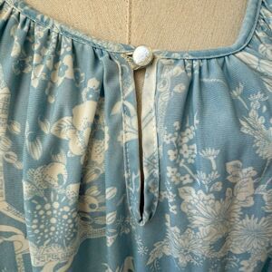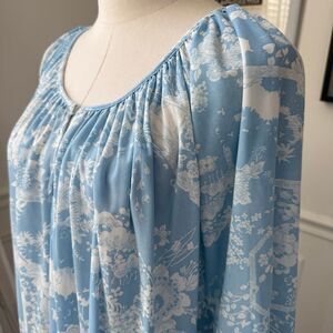 70s Mistee 100% nylon gown with gathered cuff and keyhole neck with single button closure in a blue and white print that me looks like a cross between Asian and folk Hart inspired. My mom would call this color delft blue. Made in the USA. I think this is supposed to be a nightgown, but it is pretty enough that I think it could also be worn as a maxi dress. Wide scoop neck with gentle folds for a relaxed fit. Tax size medium. Laying flat measures 23 inches armpit to armpit, 30 inches straight across the waist and 51 inches shoulder to him. It’s relatively opaque for a nightgown so I think it could also make a very hippie looking maxi dress. Belt it or wear it as a kaftan or mumu
