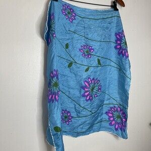 Preloved in good conditon: white trim. Blue with purple and pink flowers wirh green stems. Lightweight bandana/ scarf. No fabric or size tag.