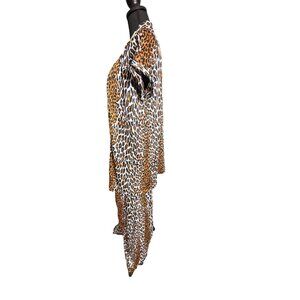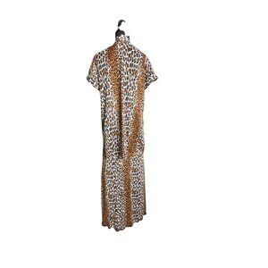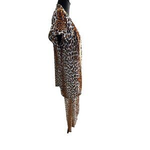 Embodying the bold and glamorous 70's era, this leopard print robe and long gown exudes sensuality. Its lightweight nylon material drapes effortlessly, making it ideal for lounging in style.
