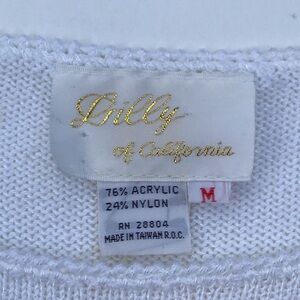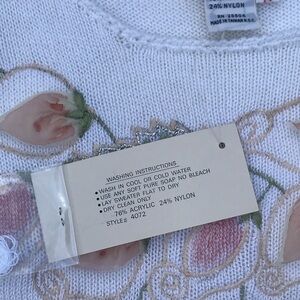 Vintage Lilly of California 1970s knit short-sleeved sweater top, embellished and embroidered with pink watercolor taffeta rose buds and leaves outlined in silver thread. White knit. An unbelievably gorgeous vintage piece, completely new with original tags!