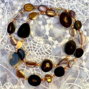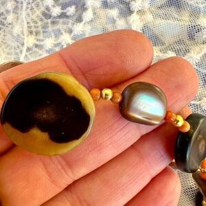 Vintage genuine polished Horn slices, genuine glowy Abalone/Mother of Pearl chunks and tiny genuine Salmon Coral beads mix with (I think - I haven't tested) tiny old gold tone beads. 25” with gold tone spring clasp and strung on silk. Well made, unique & eclectic.