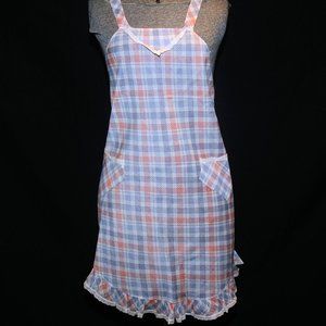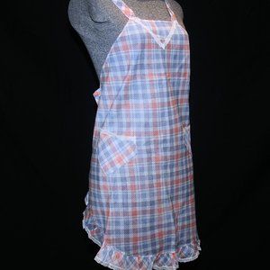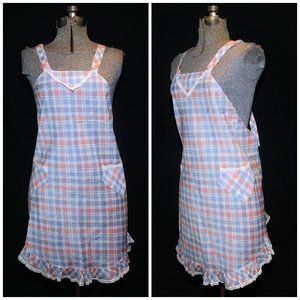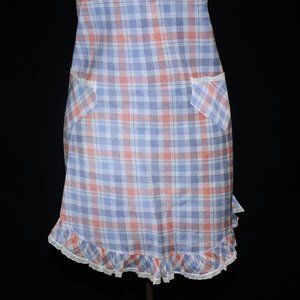 Vintage 70's Orange & Blue Plaid Check Full Bib Apron w/ Lace Criss Cross Back