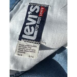 Made in the United States, these jeans have a 33-inch waist, 34 inch inseam and are designed for a regular fit. The denim material ensures durability, while the brand's signature stitching and design with Talon zipper, and orange tab offer a timeless style. These Levi's are a must-have for any vintage clothing enthusiast looking to add a touch of retro flair to their wardrobe.