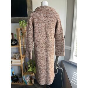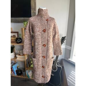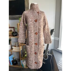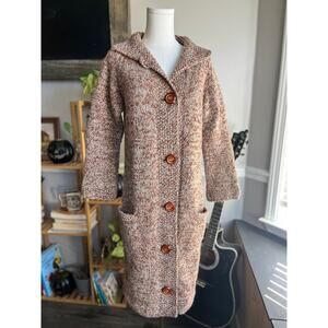 Handmade long line knit sweater jacket with square pockets and large burnt orange buttons down the front.